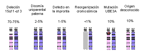The Angelman syndrome (AS) is caused by different genetic mechanisms affecting the 15q11-q13 region which is regulated by imprinting. Thus, only one of the two copies of the genes in this region will be expressed depending on its parental origin. One of the genes in this region is the UBE3A gene that is only expressed from the maternal allele in the brain. Genetic abnormalities on the maternal copy of this gene cause the AS. It is important to confirm the clinical diagnosis and establish the genetic mechanism in order to offer a genetic counselling.