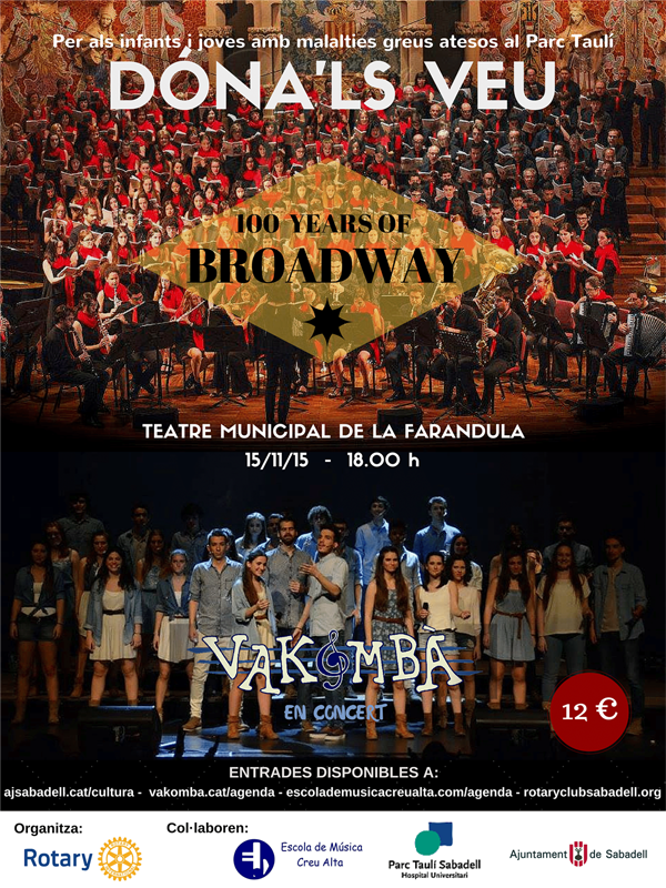 El Teatre Municipal La Faràndula de Sabadell acollirà el diumenge 15 de novembre, a les 18h, la gala solidària ‘Dóna’ls veu’ amb les actuacions dels Cors i Banda de l’Escola de Música Creu Alta amb l’espectacle Espectacle ‘100 anys de Broadway’, i del cor Vakombà, un dels cors participants a la segona edició del concurs de TV3 ‘Oh Happy Day’.