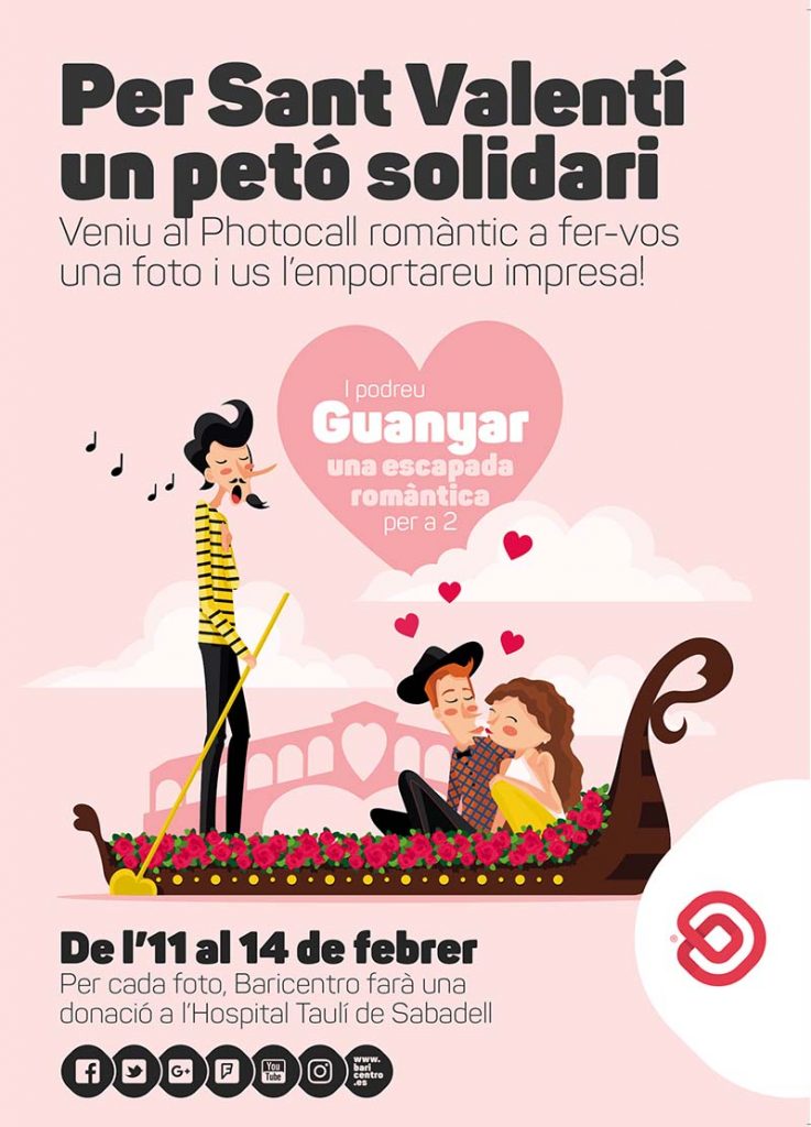 El Centre Comercial Baricentro inicia de l’11 al 14 de febrer una acció solidària amb la finalitat de recaptar fons per al Programa d’Acció Social de Pediatria del Parc Taulí. L’acció consisteix en la participació en un “Photocall romàntic”. Totes les persones que es facin una fotografia participaran en un concurs.