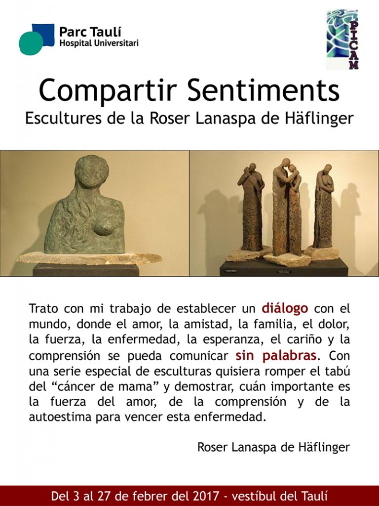 Des 3 al 27 de febrer es pot visitar al vestíbul de l’edifici Taulí l’exposició d’escultures “Compartir Sentiments”. La mostra consta de 29 obres en bronze de l’escultora Roser Lanaspa de Häfliger.
