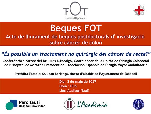El proper dimecres 3 de maig, a les 13 h, l’Auditori Taulí acollirà l’acte de lliurament de les beques postdoctorals d’investigació sobre càncer de còlon de la Fundació Olga Torres (FOT) en la seva dotzena edició.