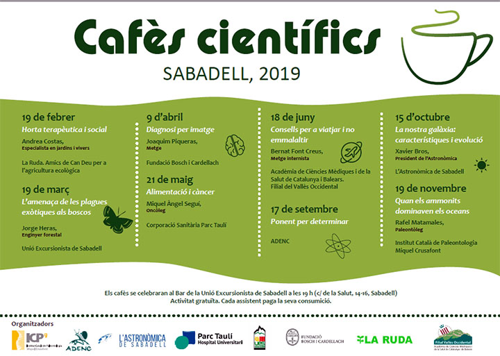 L’horta terapèutica i social, l’amenaça de les plagues exòtiques als boscos, el diagnosi per imatge, l’alimentació i el càncer, consells per a viatjar i no emmalaltir, les característiques de la nostra galàxia i els ammonits dels oceans, són els temes de la nova edició “Cafès científics. Sabadell 2019”, organitzats per vuit entitats de la ciutat dedicades a la recerca i divulgació. Les sessions se celebren un dimarts al mes, a les 7 de la tarda, al Bar de la Unió Excursionista de Sabadell (c/ De la Salut 14-16 Sabadell). Les xerrades són gratuïtes.