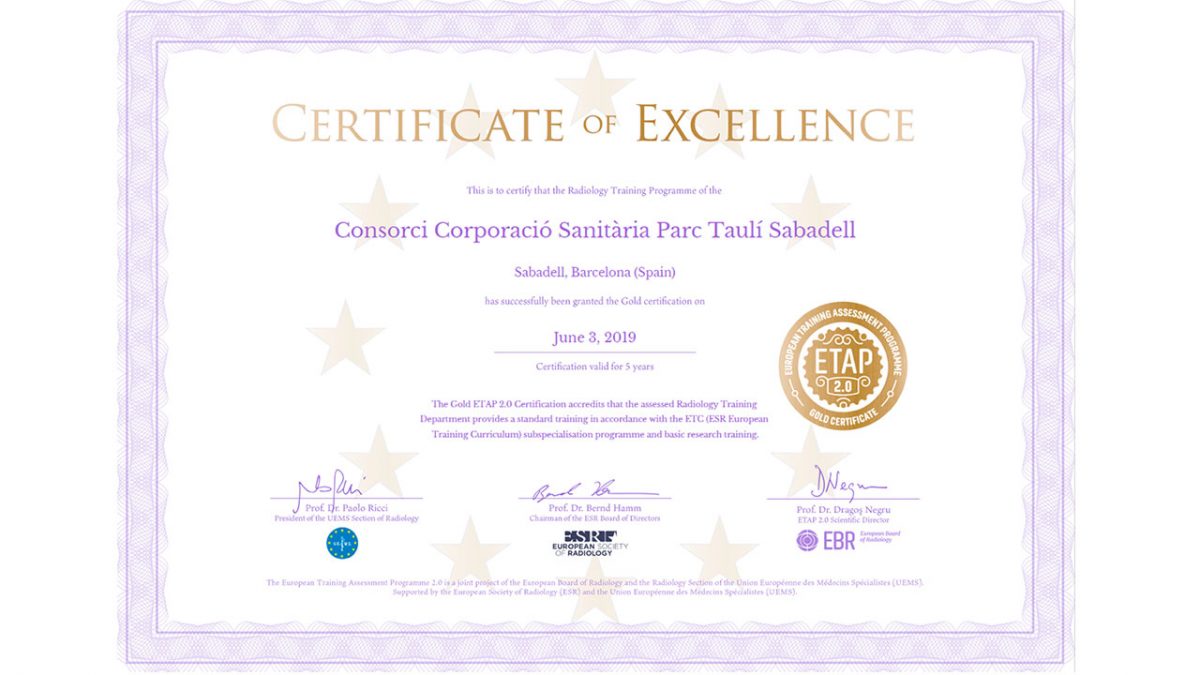 Aquesta certificació valora la qualitat docent d’un Servei de Radiologia. Està concedida per la UEMS (European Union of Medical Specialist) i la European Society of Radiology, en concret a través de la ETAP (European Training Assessment Programme.). El Parc Taulí és el segon centre de Catalunya que rep aquesta acreditació.