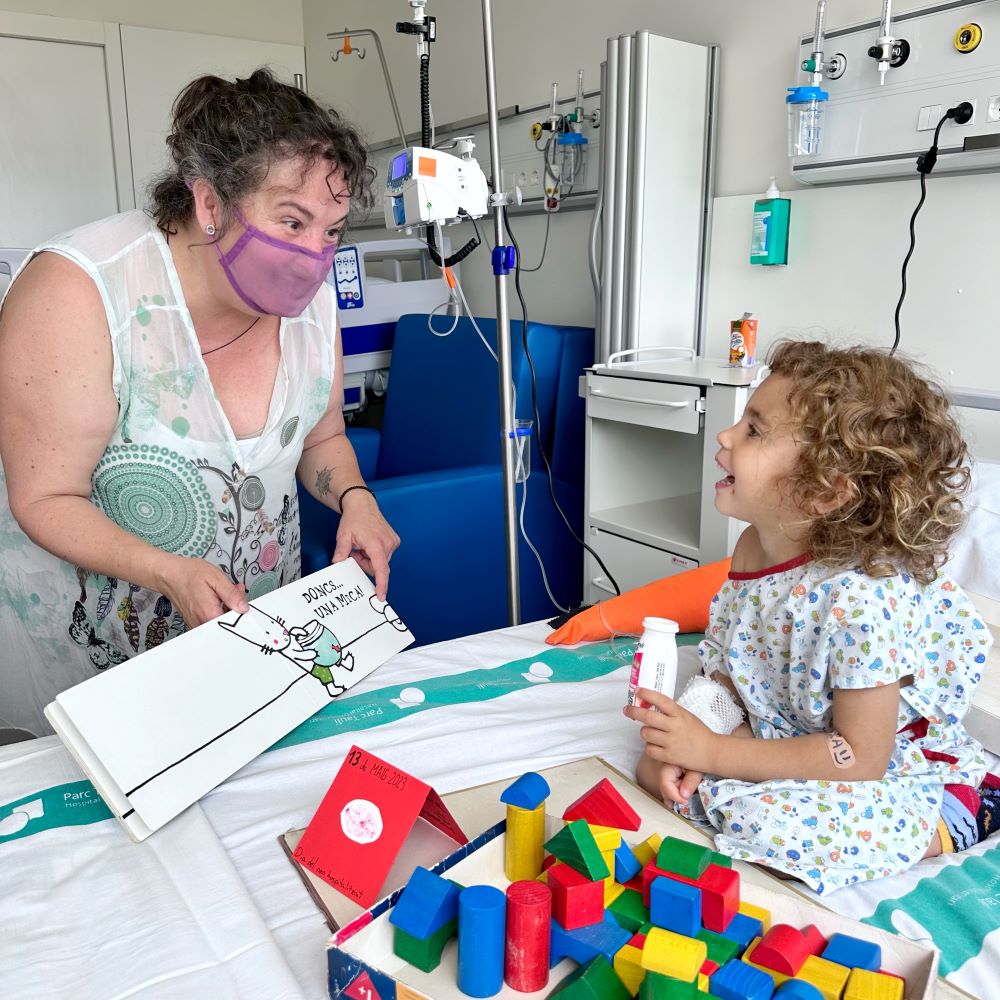 Les nenes i els nens que aquests dies estan ingressats a la planta de pediatria han pogut gaudir dels contes escollits específicament per a ells: Ernest de Lola Casas; Que ve el llop de l’Émile Jadoul o L’eriço de Gustavo Roldán, entre d’altres, que ha llegit la narradora, Susagna Navó, de l’Associació Caravàs.