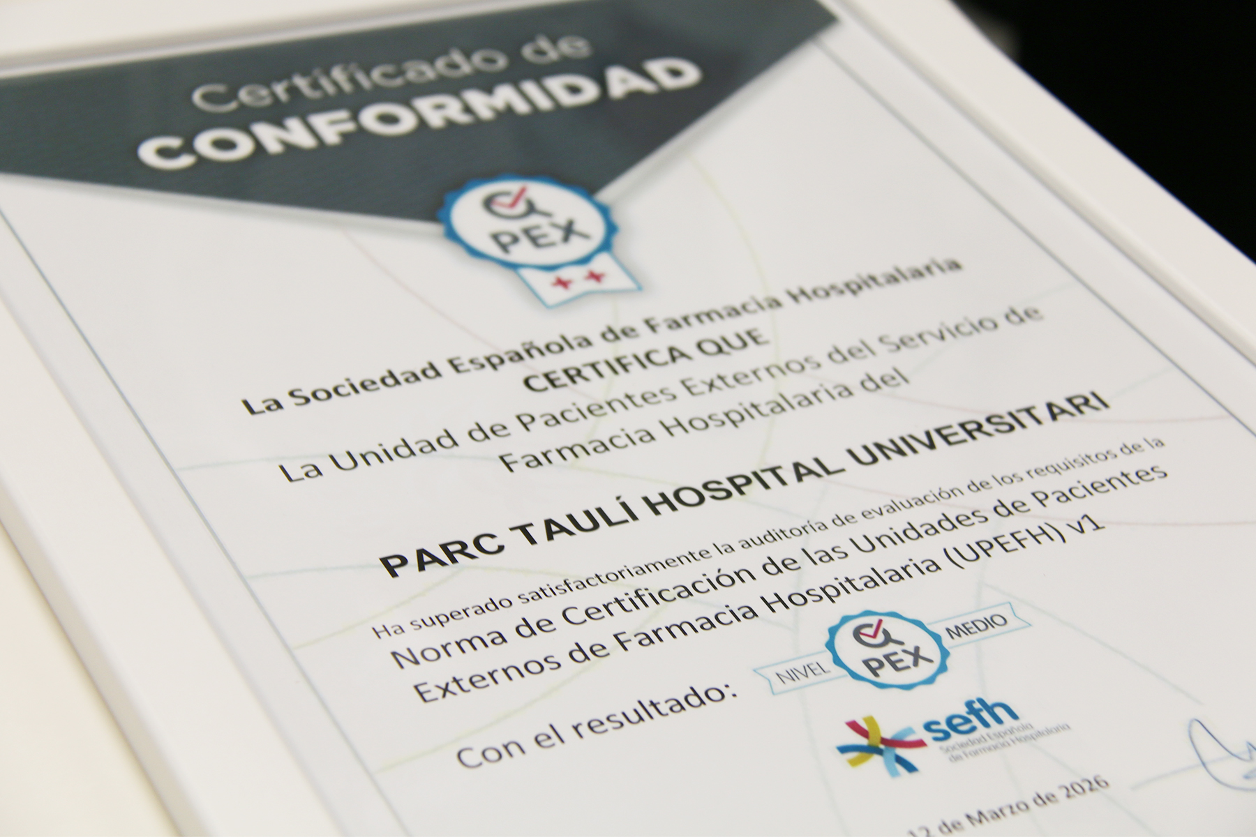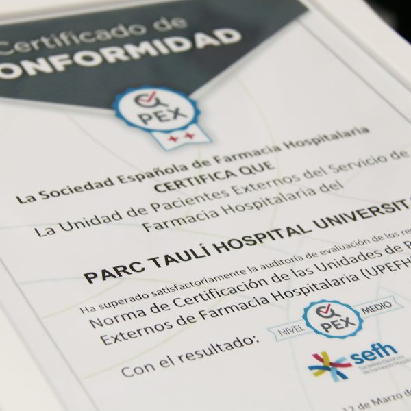 El servei de Farmàcia Hospitalària del Parc Taulí, i més concretament la Farmàcia Ambulatòria i del Pacient Extern (UFAPEx), ha estat reconeguda amb la Certificació d’Unitat de Pacient Extern de Farmàcia Hospitalària (Q-PEX) de nivell mitjà per part de la Societat Espanyola de Farmàcia Hospitalària (SEFH), convertint-se en la primera unitat acreditada de la província de Barcelona i en la tercera a Catalunya, juntament amb l’Hospital Universitari Josep Trueta de Girona i l’Hospital Universitari Joan XXII de Tarragona.