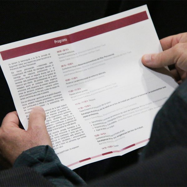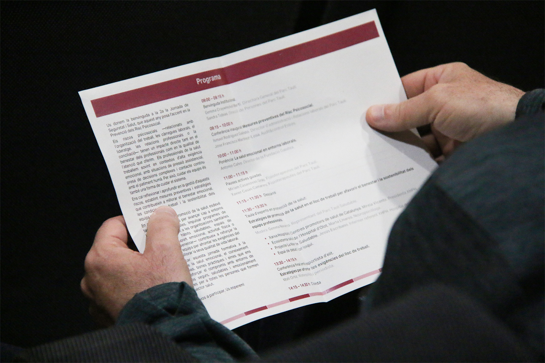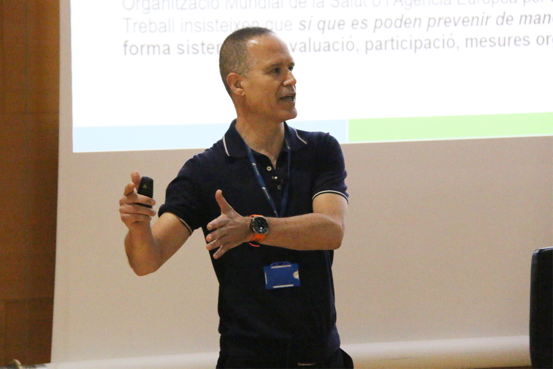 Seguidament, ha tingut lloc la conferència “Mesures preventives del Risc Psicosocial”, de la mà d’Ismael Rodríguez, director d’administració i relacions laborals del CCSPT, i José Francisco Martínez-Losa de l’empresa Audit&control Estrés. A continuació, l’Antoni Calvo, director de la Fundació Galatea, ha brindat una ponència centrada en la importància de la salut emocional en els entorns laborals.