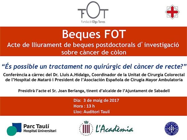 El Parc Taulí va acollir ahir l’acte de lliurament de les beques de la Fundació Olga Torres per a treballs de recerca sobre càncer de còlon https://www.tauli.cat/actualitat/wp-content/themes/corpus/images/empty/thumbnail.jpg 150 150 Actualitat Parc Taulí https://www.tauli.cat/actualitat/wp-content/themes/corpus/images/empty/thumbnail.jpgLa Fundació Olga Torres (FOT) destina 120.000 euros anuals a finançar projectes de recerca sobre càncer de còlon. La FOT ha rebut aquest any la Creu de Sant Jordi atorgada pel Govern de la GeneralitatLa Fundació Olga Torres (FOT) destina 120.000 euros anuals a finançar projectes de recerca sobre càncer de còlon. La FOT ha rebut aquest any la Creu de Sant Jordi atorgada pel Govern de la Generalitat.