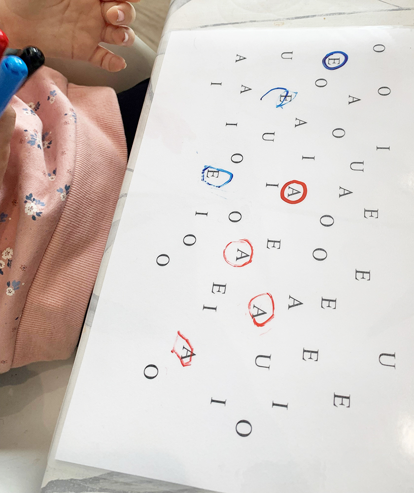 En el nostre cas, el tenim plastificat i fem servir rotuladors de colors (un color per a cada vocal); d’aquesta manera els treballem, doncs anem canviant i això també fa que no acabi associant un color a la vocal.