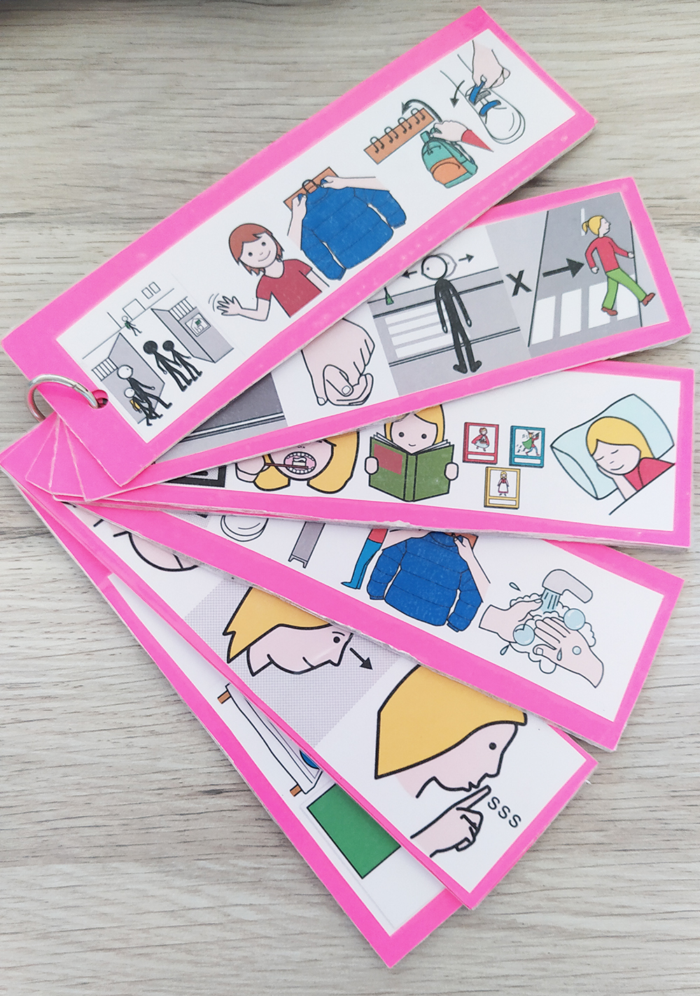 En nuestro caso, como a nuestra hija Arlet le cuesta más atender y comprender a través de las indicaciones que le damos con el lenguaje verbal, hemos puesto en práctica lo que nos indicó la logopeda sobre las imágenes. No sabíamos cómo organizarlo para que fuera práctico; necesitábamos algo llevadero para poder tenerlo en cualquier espacio de la casa e incluso fuera de ésta. No nos era práctico tenerlo pegado en una pared y hacer que la peque se dirigiera a este punto cada vez que lo necesitábamos.