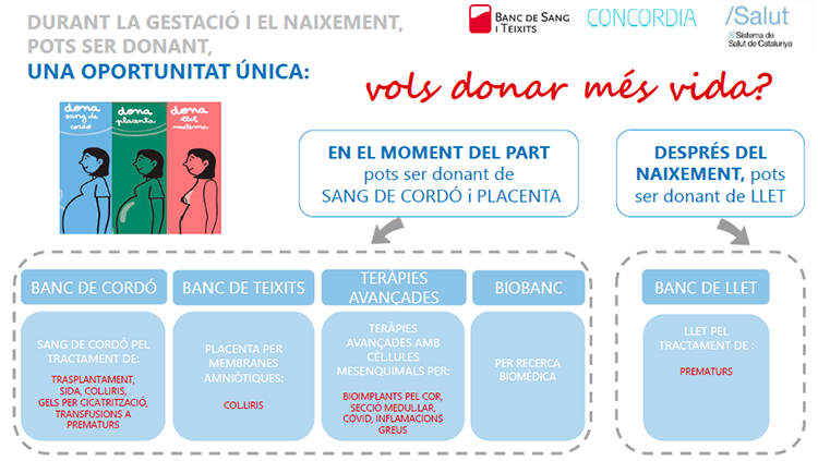 - Donació de placenta. Ajuda les persones amb problemes de visió, cremades o úlceres. Departament de Salut (Gencat) i Banc de Sang i Teixits.