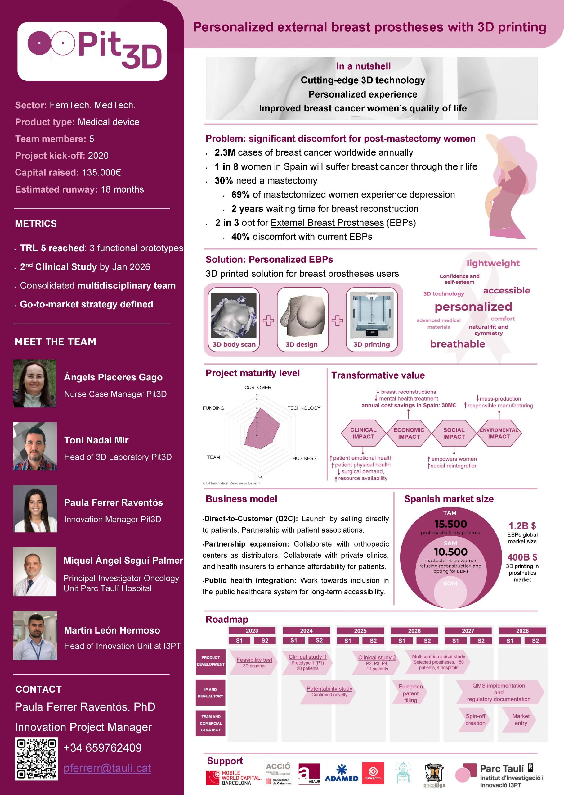 Impacte econòmic: Optimitza l’ús dels recursos sanitaris i disminueix significativament les despeses vinculades a reconstruccions mamàries i a tractaments de salut mental postmastectomia, que actualment poden superar els 72 milions i 40 milions d’euros anuals a Espanya. Amb una adopció moderada, Pit3D podria generar un estalvi net de prop de 30 milions d’euros l’any, alhora que descongestiona els serveis hospitalaris i allibera quiròfans i professionals especialitzats, millorant l’eficiència assistencial en altres àrees.